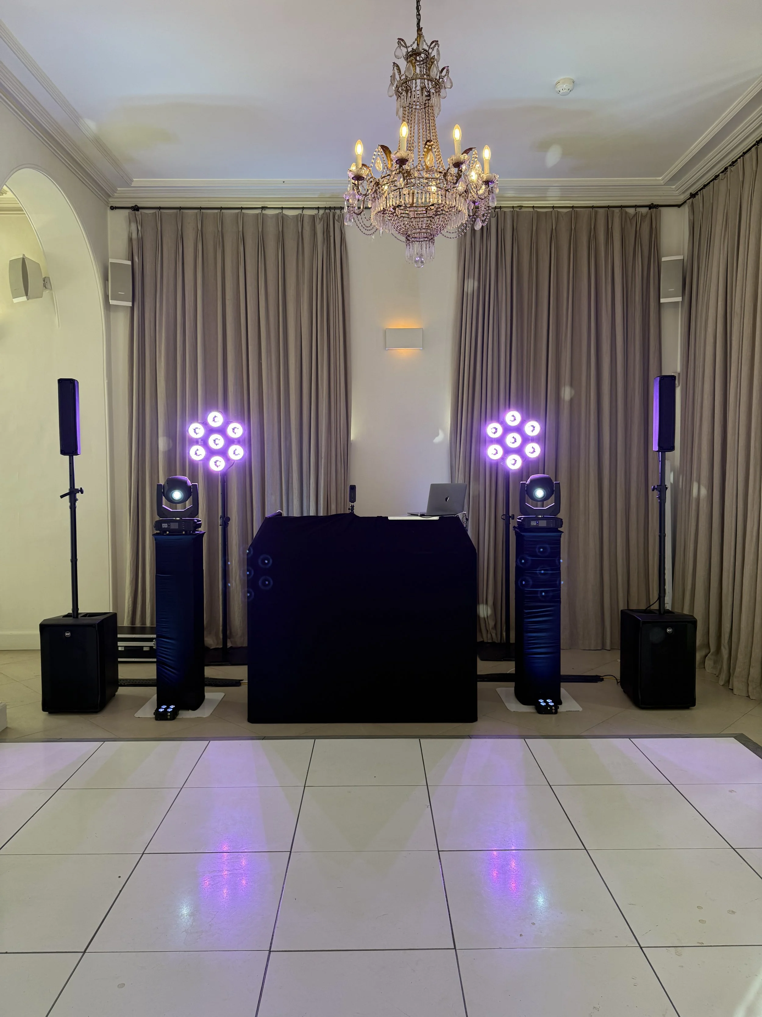 Take your celebration to the next level with our custom lighting service. From romantic spotlight moments to high-energy club-style effects, our tailored light shows are designed to match the vibe of your event. Pair this with our stylish venue uplighting to create a truly unforgettable atmosphere.