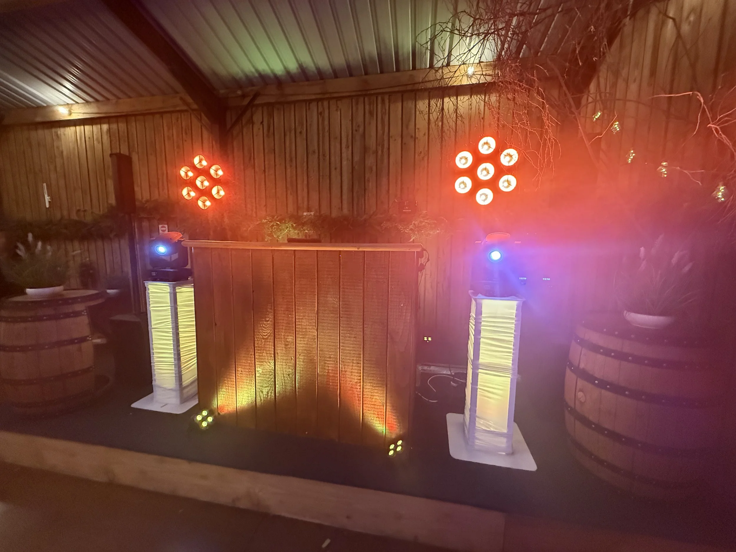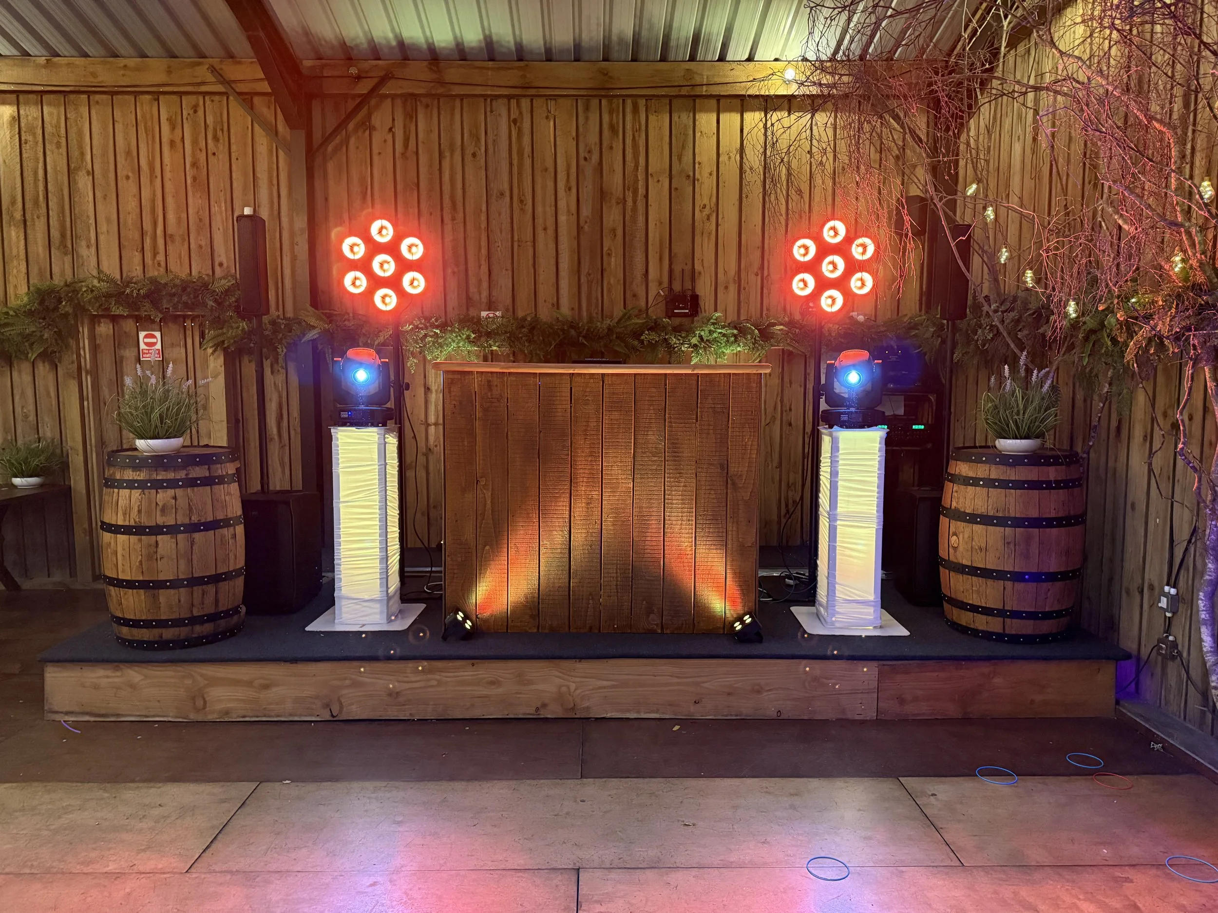 Can be paired with soft uplighting and dancefloor lighting to enhance the atmosphere while staying true to the rustic aesthetic.